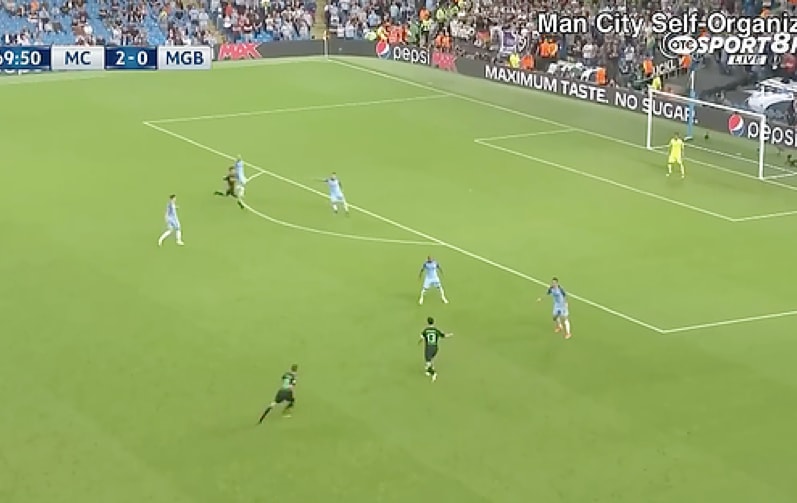 In this example, Manchester City lost possession when John Stones (CB) and Kolarov (LB) were positioned as midfielders to cause disorganization in the opponents structure. More so, only Otamendi (CB) and Fernandinho (DCM) were positioned in the defensive line. However, in the end Manchester City self-organized themselves to create a defensive line of (from right to left) Kolarov (LB), Fernandinho (DCM), Otamendi (RCB), and Zabaleta (RB).