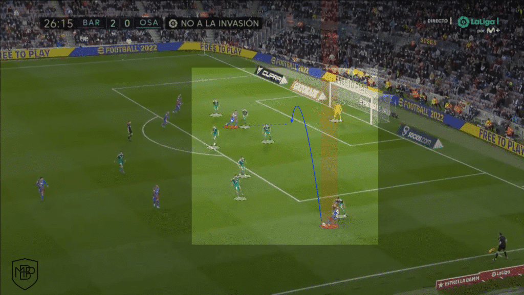 Furthermore, the application of the IFP is essential within the Barca game model and in the positional play that Xavi wants to execute for his side. With the correct application of the fundamental, the team always have a wide passing line, while also forcing the defending team to be stretched out wide in order to defend this.
