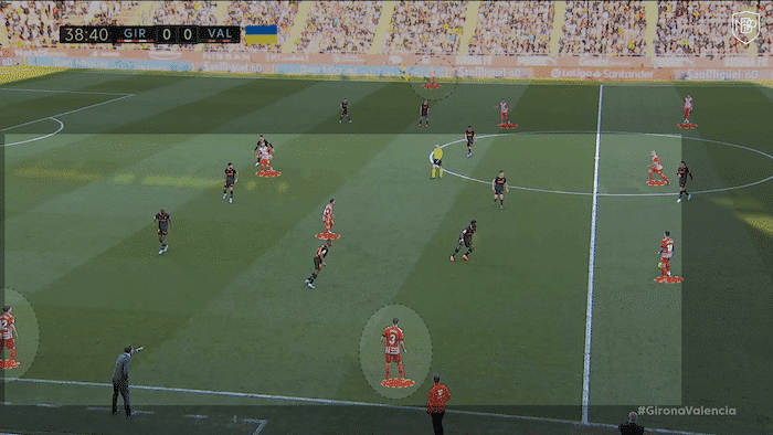 Likewise, another of Girona’s great tactical qualities is ‘how’ they are using/occupying the wide sectors. In this case, we can see that the width is used through different sub lanes.
