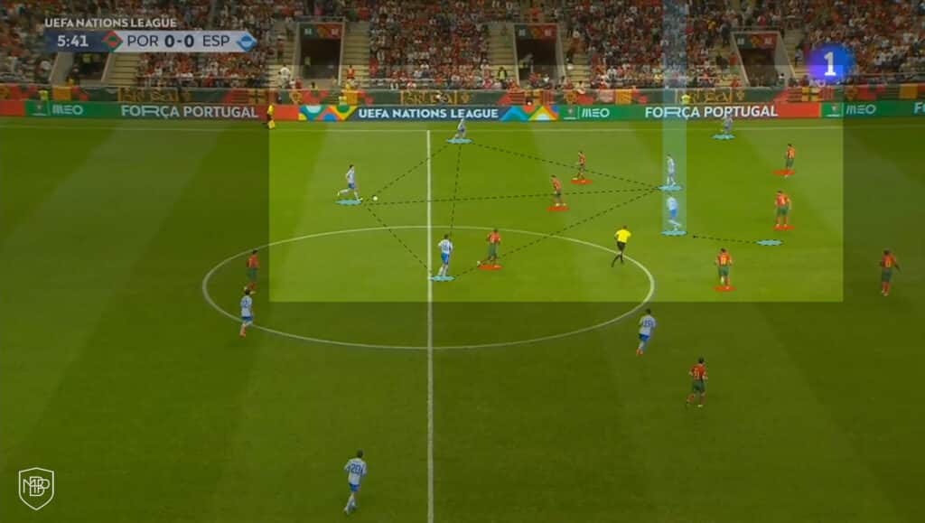 For the proper development of the game idea, Spain always aim to ensure the application of the general ‘triple threat’ principle, i.e. to ensure width, depth, and the occupation of intervals at all times.