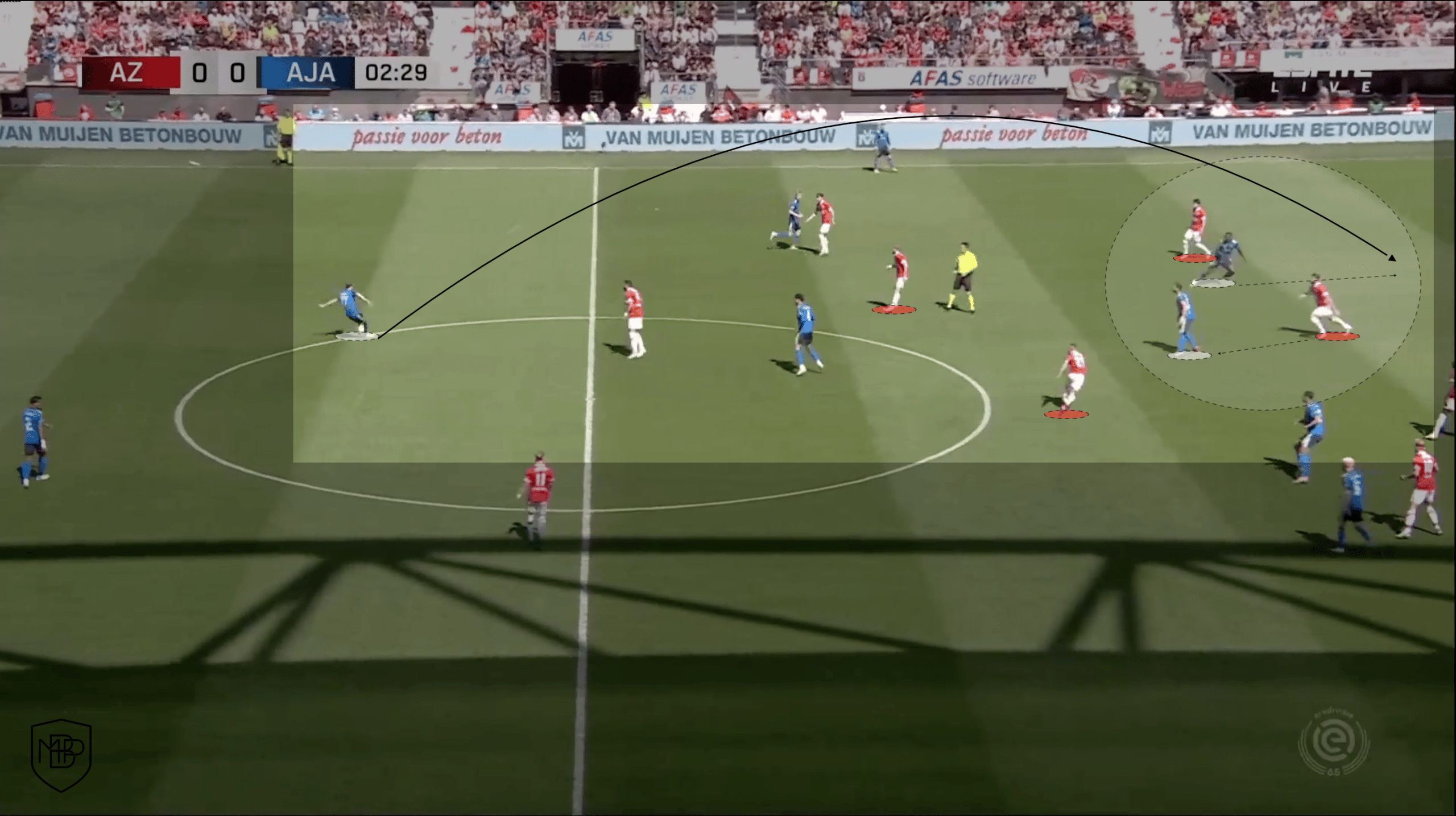 Otro aspecto que intentará aplicar el nuevo técnico red devil, será la creación de triángulos dentro del terreno de juego, en especial en carril central. Durante su etapa en el conjunto de Ámsterdam, Ten Hag ha buscado acumular muchos jugadores en carril central. Gracias a ello, conseguía tener un mayor número de líneas de pase, consiguiendo así, tener una mayor circulación de balón, ya fuese mediante pases directos a primera o segunda línea, o a través del concepto del “3er hombre”.