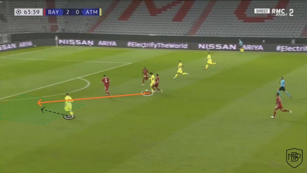 El jugador del Atletico de Madrid tiene una gran capacidad para poder realizar este tipo de pases, gracias a la aplicación del primer fundamento analizado, que le posibilita poder recibir el balón en zonas intervalicas y poder filtrar este tipo de pases a sus compañeros cerca de la zona de finalización.