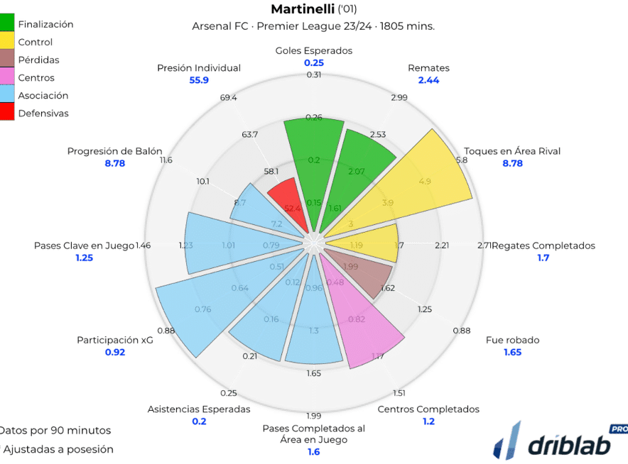Figura 3. Gráfico sobre las acciones de Gabriel Martinelli durante la temporada 23/24 en la Premier League con el Arsenal. Fuente: Driblab