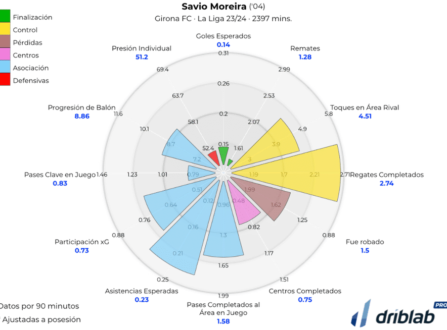 Figura 6. Gráfico sobre las acciones de Savio Moreira “Savinho” durante la temporada 23/24 en la Premier League con el Manchester City. Fuente: Driblab