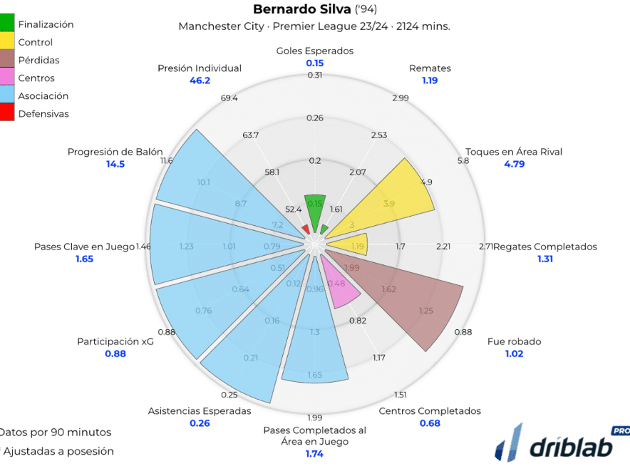Figura 9. Gráfico sobre las acciones de Bernardo Silva durante la temporada 23/24 en la Premier League con el Manchester City. Fuente: Driblab