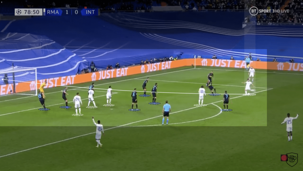 Gracias a su brillante conducción de balón y su potencia de tren inferior, el madridista consigue dejar atrás a los rivales y llegar con cierta facilidad al interior del área para posteriormente intentar superar al portero rival.