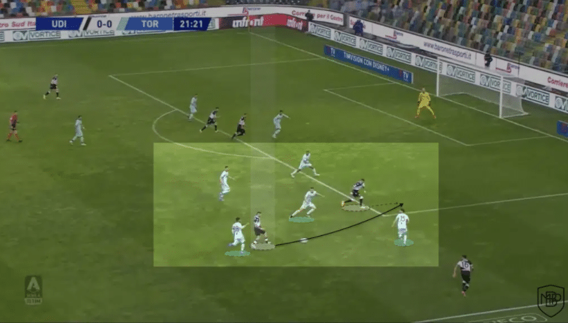 O segundo fundamento que se destaca na sua aplicação tática é a capacidade de “orientar o jogo para espaços favoráveis”. Seja por mudanças diretas ou indiretas de orientação, Rodrigo de Paul sabe identificar quando houve acúmulo de adversários em um setor do campo, e direcionar o jogo para colegas que tenham vantagem espacial.